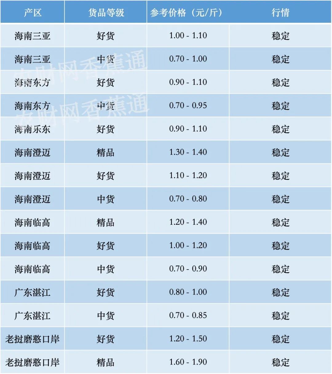 广东湛江市场好货价格为0.80-1.00元/斤,中货价格为0.70-0.85元/斤,不抹花香蕉价格为0.40-0.50元/斤,较上一日价格稳定,市场走货少,产区货源供应稳定,销区市场需求一般,客商需求一般。